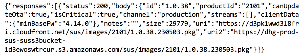 与固件更新过程类似,Harmony Hub会向GetUpdates所指定的端点发送一个POST请求,请求中包含设备内部软件包的当前版本信息。HEOS软件包对应的请求如图11所示。