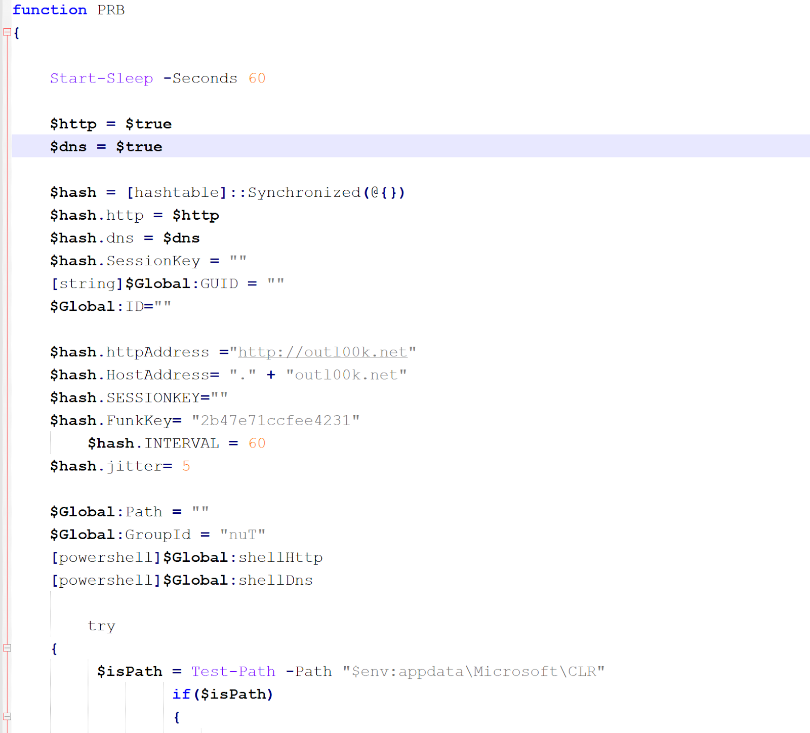 我们尝试在沙箱中运行该样本,但没有捕获到任何网络通信。然而,在分析代码的过程中,我很早就注意到了一个值为$hash.httpAddress =”http://outl00k[.]net”的变量,看上去这是后门进行通信的主要域名,适用于该样本中的所有函数。
