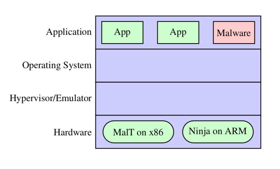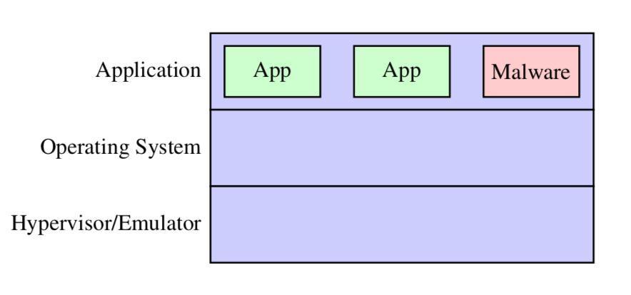 透明分析是指针对恶意软件的分析而无法被恶意软件感知,从而不能恶意软件检测到。恶意软件的检测和反检测是一个对抗过程,并在持续的升级。这种对抗从软件的用户层到操作系统的内核层,再到更底层的虚拟机(hypervisor)或模拟器。