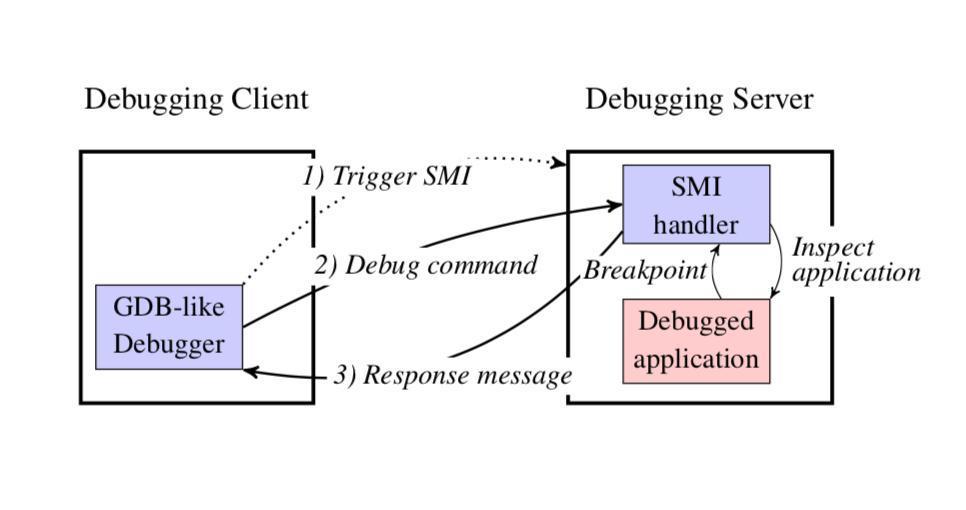 MaIT主要是利用x86架构中存在的一个系统管理模式(System Management Mode, SMM)来实现透明的调试分析。MaIT利用SMM构建一个硬件隔离的执行环境,该执行环境无法被其他代码所检测到。如下图所示,MaIT包括一个调试客户端和一个调试服务端。调试客户端可以通过(System Management Interrupt)SMI中断来进入服务端的SMM环境,在SMM环境中进行相应的调试分析,并将相应的结果返回给客户端。