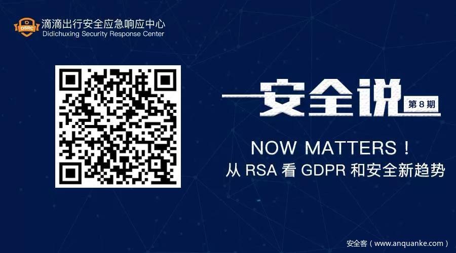没能亲临RSA现场的小伙伴,可以来滴滴出行【安全说】第8期,听业界大咖——思睿嘉得创始人董靖(DJ),Sec-UN创始人金湘宇(NUKE),深入分析解读GDPR和安全发展新趋势。
