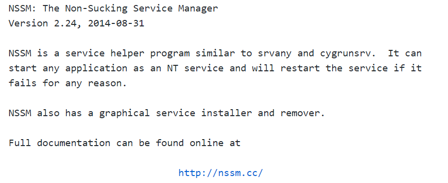 其中NSSM是一个服务管理工具,它可以以NT服务开启应用,无论应用以何种方式失败均会尝试重启应用,参考其说明: