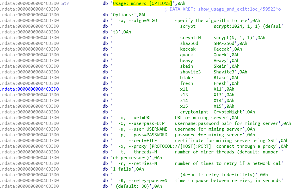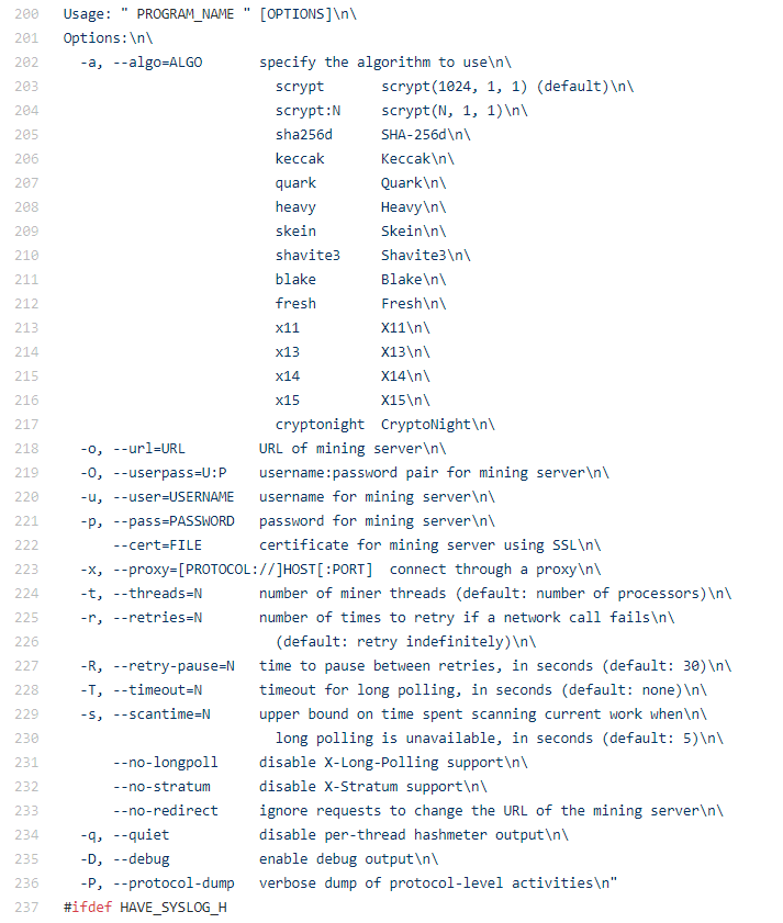 通过分析,Systmss.exe的代码完全是基于cpuminer-multi开源项目,cpuminer-multi是一个开源的多线程CPU挖矿程序,从其github页面可知,当前支持的算法较多,