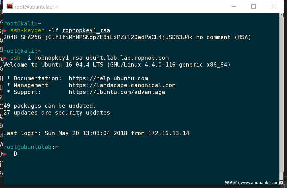 为了验证秘钥的有效性,我将秘钥拷贝回Kali系统中,验证了秘钥的指纹信息,并且可以使用该秘钥来登录SSH。