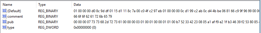 事实的确如此,查找注册表后,我发现有两处信息与我执行的ssh-add有关。其注册表项名为公钥的指纹字符串,对应的值中包含一些二进制数据块: