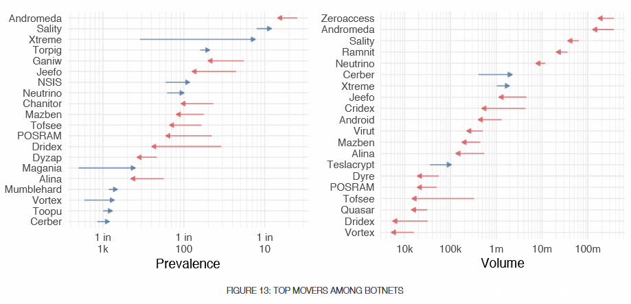 总体而言,2018年第一季度的僵尸网络呈下降趋势,它们多数都丢失僵尸、关闭或比之前季度的活跃性要差(如下表所示的红箭头丰度所示。)