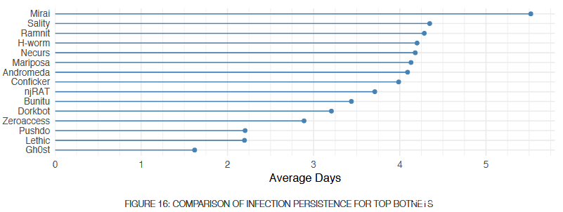 Mirai 僵尸的平均存活时间是5.5天。紧随 Mirai 的其它僵尸网络是 Sality(垃圾邮件和代理)、Ramnit(银行木马)、H-worm(下载器)、Necurs(垃圾邮件)等。