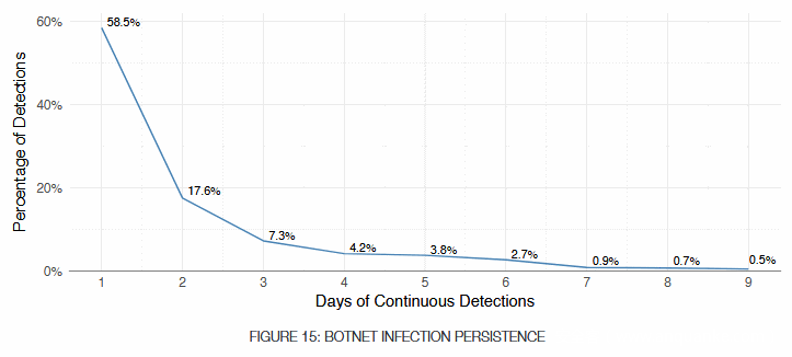 报告指出,多数僵尸网络感染 (58%) 时长不超过1天;17.6%的僵尸网络感染持续2天的时间;7.3%的僵尸网络感染持续3天,而仅有5%的僵尸网络感染时间超过一周。