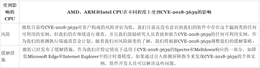 在深入了解技术细节之前,下面简要总结受SSB影响的CPU,Microsoft对风险的评估以及迄今为止确定的缓解措施。