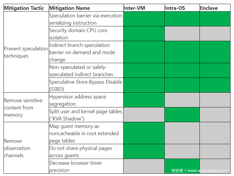 这些问题的复杂性使得难以理解缓解措施,推测技术和它们所应用的攻击情景之间的关系。本节提供表格来帮助描述这些关系。以下表格中提到的一些缓解技术在我们之前关于此主题的博客文章中进行了描述。