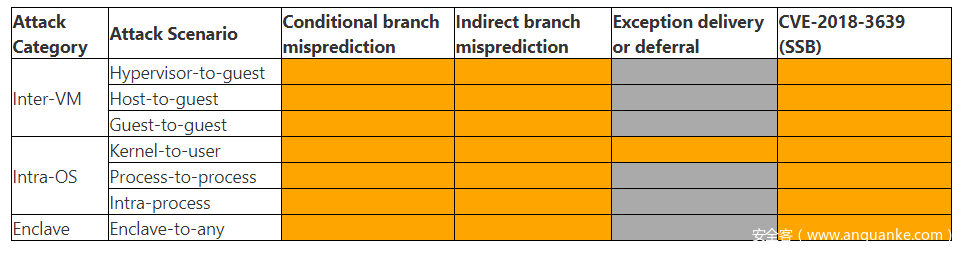 下表总结了SSB与软件安全模型通常关心的各种设备内攻击情况的潜在相关性。与CVE-2017-5753(幽灵变体1),SSB是理论上适用于由橙色作为指示的每个攻击场景(灰色单元格表示不适用)。