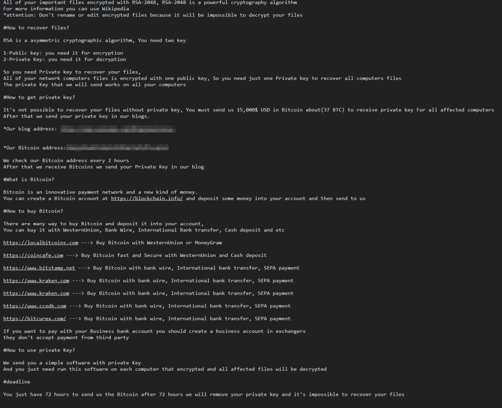 在某些情况下,具有相同内容的HELP_DECRYPT_YOUR_FILES.html也会被投放在当前目录中。Samsam恶意软件的所有变种都有一个奇怪的行为,针对每个被加密的文件都会投放一次赎金通知。因此,在多个文件被加密的目录中,会出现多个该文本文件或HTML文件。
