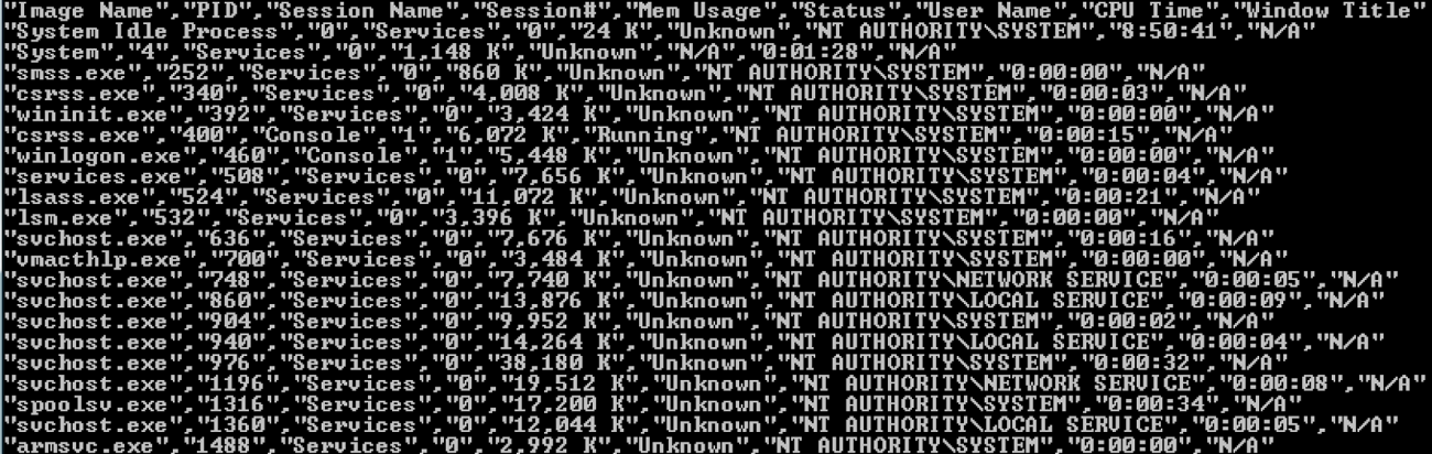 (1) 通过以下命令,调用tasklist.exe,在系统上生成正在运行进程的列表:tasklist /v /fo csv