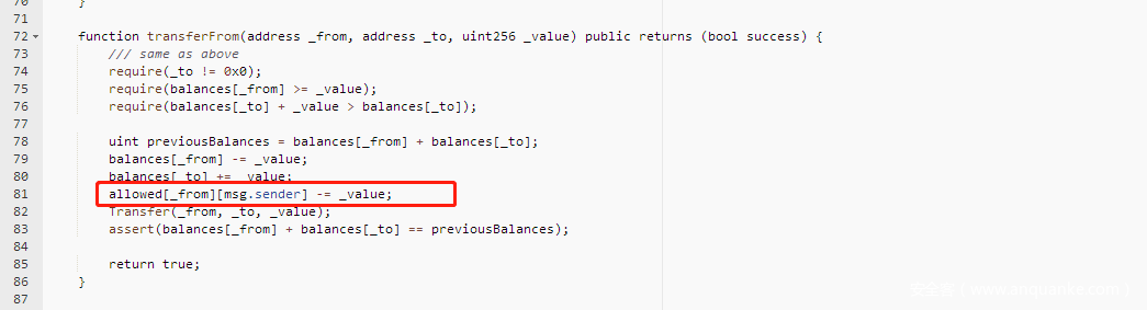 经过分析发现EDU代币的transferFrom函数中,allowed[from][msg.sender]减去要转账的数字时候,没有对比allowed[from][msg.sender]的值与value的值得大小,从而使得可以转走比allowed[from][msg.sender]大的数目的代币。