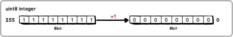 8 位无符整数 255 在内存中占据了 8bit 位置,若再加上 1 整体会因为进位而导致整体翻转为 0,最后导致原有的 8bit 表示的整数变为 0.