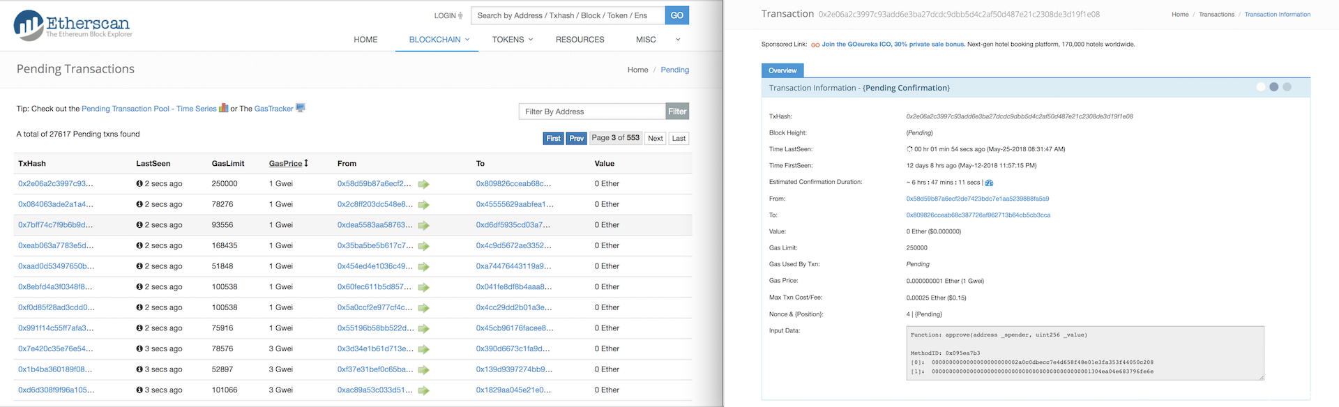 在 etherscan.io 就能看到还未被确认的 TX,并且能给查看相关数据: