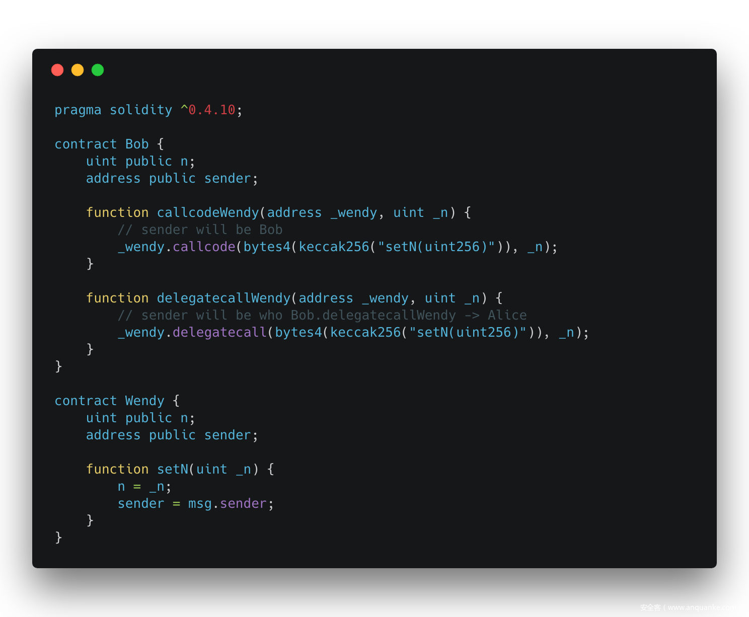 例如 Alice 通过 callcode() 调用了 Bob 合约里同时 delegatecall() 了 Wendy 合约中的函数,这么说可能有点抽象,看下面的代码: