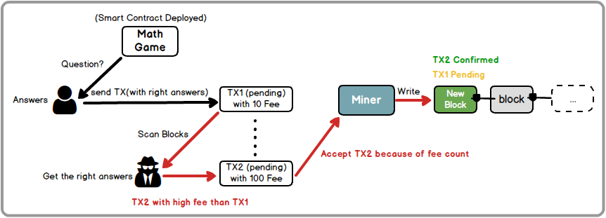 在以太坊中所有的 TX 都需要经过确认才能完全记录到链上,而每一笔 TX 都需要带有相关手续费,而手续费的多少也决定了该笔 TX 被矿工确认的优先级,手续费高的 TX 会被优先得到确认,而每一笔待确认的 TX 在广播到网络之后就可以查看具体的交易详情,一些涉及到合约调用的详细方法和参数可以被直接获取到。那么这里显然就有 Front-Running 的隐患存在了,示例代码就不举了,直接上图(形象一点):