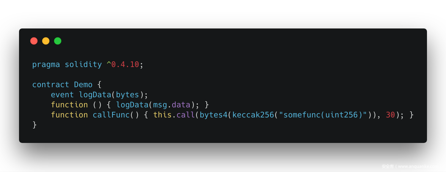 call() 用于 Solidity 进行外部调用,例如调用外部合约函数 <address>.call(bytes4(keccak("somefunc(params)"), params)),外部调用 call() 返回一个 bool 值来表明外部调用成功与否: