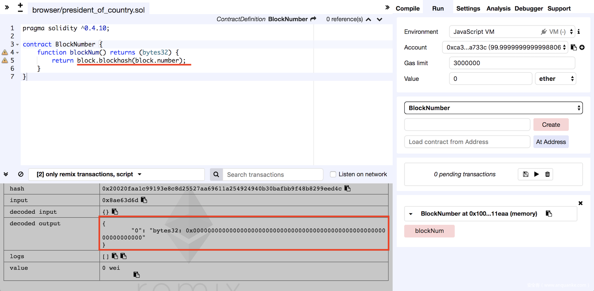就 DASP 里面提到的,还有一些合约喜欢用 block.blockhash(uint blockNumber) returns (bytes32) 来获取一个随机哈希,但是这里切记不能使用 block.number 也就是当前块号来作为 blockNumber 的值,因为在官方文档中明确写了: