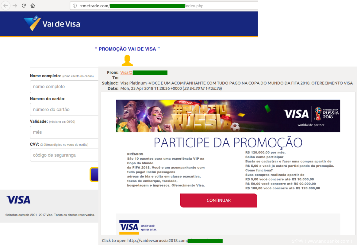 网络犯罪分子特别热衷于向Visa的中为商业赞助商的客户,并以这个国际知名的支付系统的名义提供奖品赠品。要参与该活动,用户需要点击一个指向钓鱼网站的链接(该域名在几个月前注册,与Visa系统无关),并要求他们输入他们的银行卡详细信息,包括CVV/CVC码。