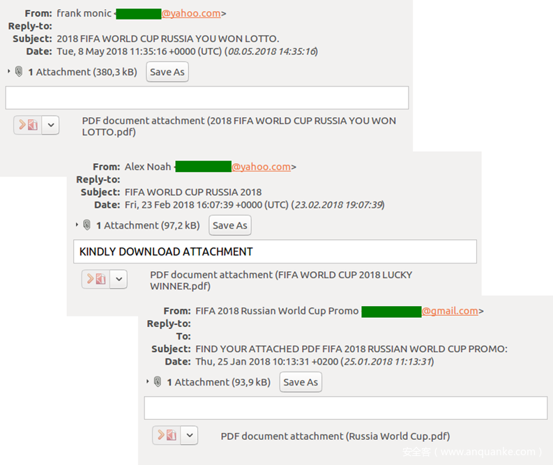 这些邮件往往包含附件(通常是PDF或DOCX文件),其中”中奖者”被祝贺并被告知回复详细联系方式(姓名,出生日期,地址,电子邮件,电话号码)以获得奖品。有时要求收件人支付一部分邮资或银行转账费用。