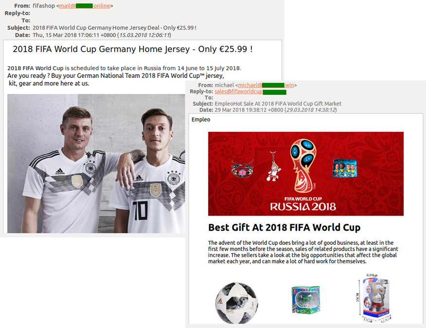 商品通常由小型在线零售商提供,包括标有官方徽标的玩具,纪念品和文具,以及世界杯参赛团队的足球服。一些消息甚至类似于来自官方FIFA商店的邮件。