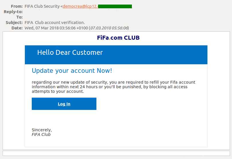 诈骗者也试图通过模仿官方FIFA通知来盗取数据。受害者会被告知安全系统已更新,所有个人数据必须重新输入才能避免锁定。信息中的链接将受害者带入一个伪造的个人账户,所有输入的数据都将直接传送给诈骗者。