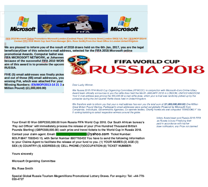 与世界杯有关的欺诈邮件之一即通知收件人在由官方合作伙伴和赞助商(Visa,可口可乐,微软等)以及FIFA本身举办的彩票中获得现金奖金。