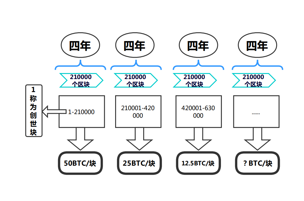 从图可以很清晰的知道,每产生210000个区块,则每一个区块产生的比特币将会减半,这个过程大概是四年时间。