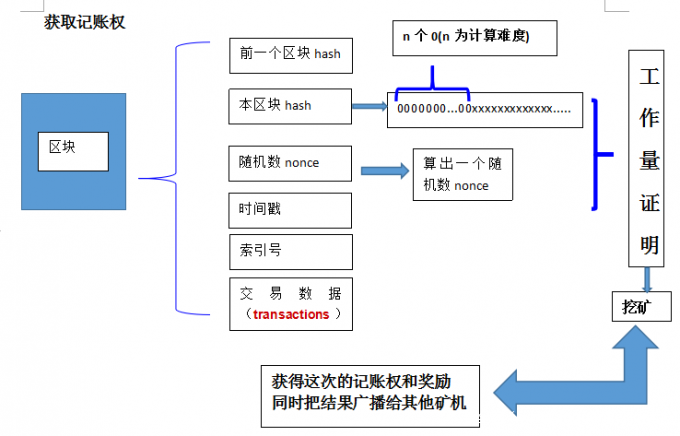 在千千万万个节点中,谁先计算出这个满足条件的hash值,谁就获得了记账权,通过把数据打包到区块获得一定的奖励。