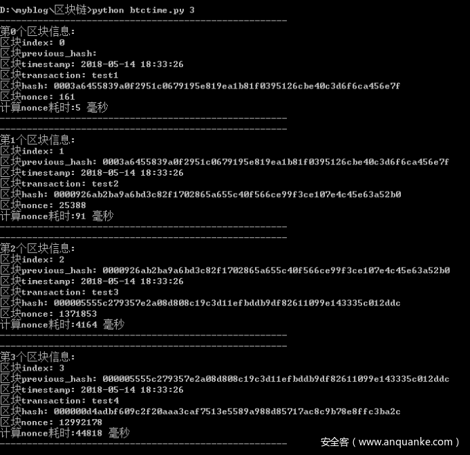 hash,nonce=hash_calculate(i,previous_hash,thetime,block_transaction[i],n+i)#后面每个区块难度加1