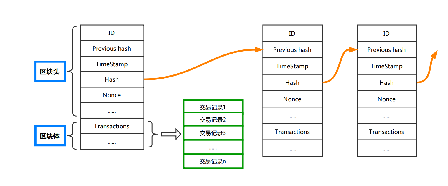 区块由区块头和区块体组成,前一个区块的hash是下一个区块的previous hash。