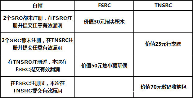 本次无论白帽在哪个SRC提交漏洞,均可以获得相应的活动积分。在活动结束后,根据活动积分排名,FSRC和TNSRC联合提供了各种玩具、礼包。