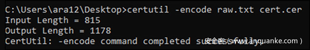 获得结果后,将其放在Windows机器上的一个名为raw.txt的文件中。你可以使用certutil对这个文件进行base64编码,并创建名为cert.cer的文件并将其放置在Web服务器上。然后,我们将构建一个将被远程调用的单行程序,用于将该文件下载并在目标上执行。一旦执行,它将调用我们的paylaod load.txt并通过PowerShell注入Meterpreter到内存中。