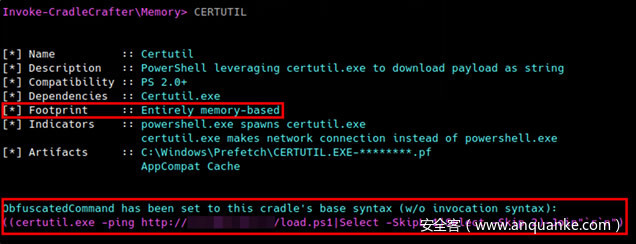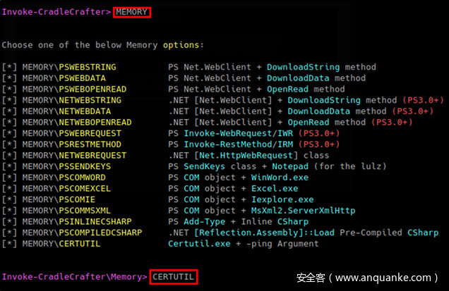 但并不是彻底凉了。最近我一直在做一些研究和准备,我将在今年晚些时候在Black Hat上介绍代码注入技术。我阅读了Microsoft有关Certutil.exe与PowerShell一起在多个博客网站上执行内存注入的文章。最后,我将推荐Daniel Bohannon编写的PowerShell模块Invoke-CradleCrafter。由于我已经使用了Invoke-Obfuscation,所以向Invoke-CradleCrafter的过渡非常轻松。