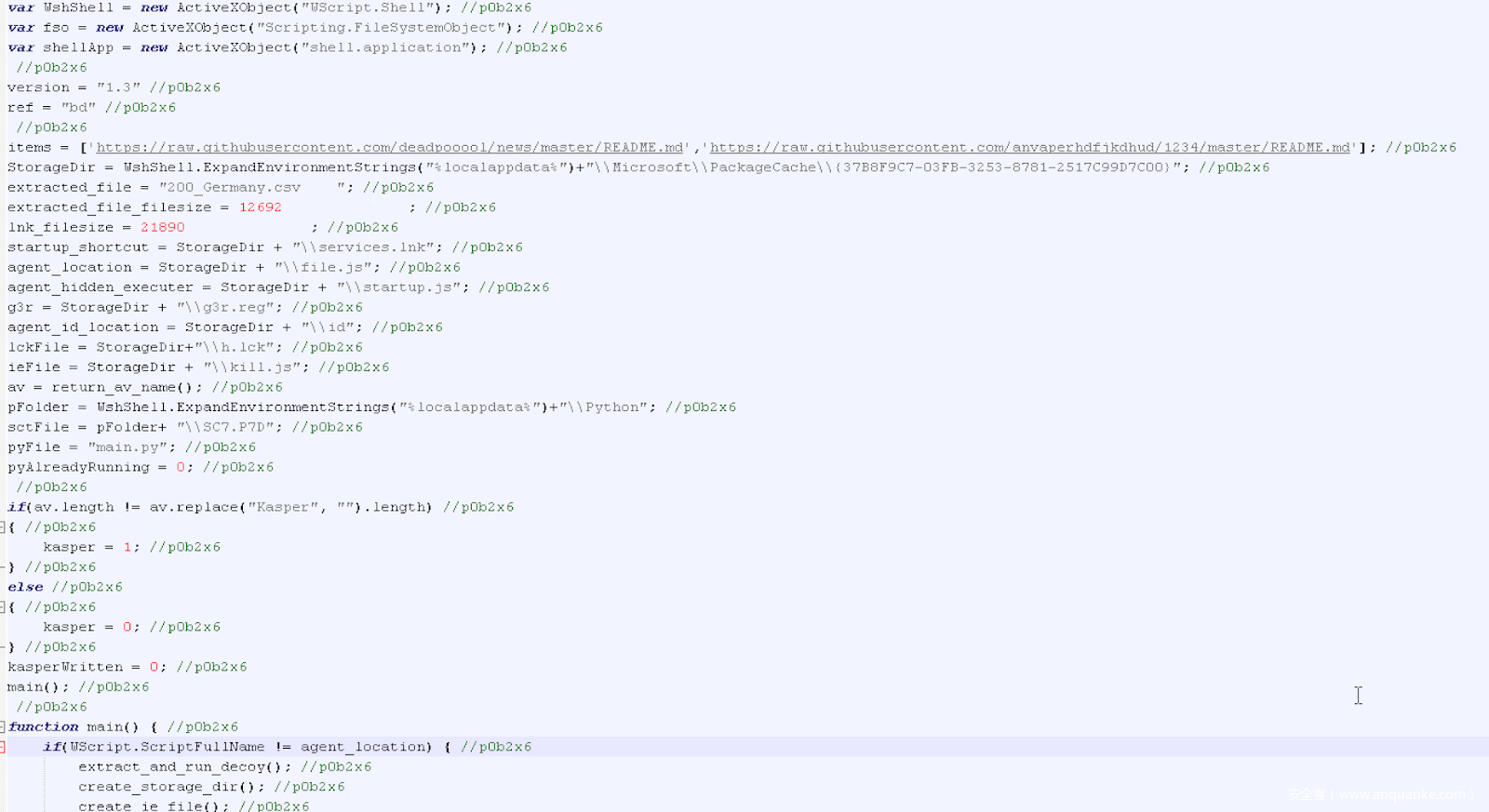 LNK文件首先搜索其中包含标记“p0b2x6”的所有代码行。这些行中都会对应将用于执行进一步恶意活动的JavaScript脚本。