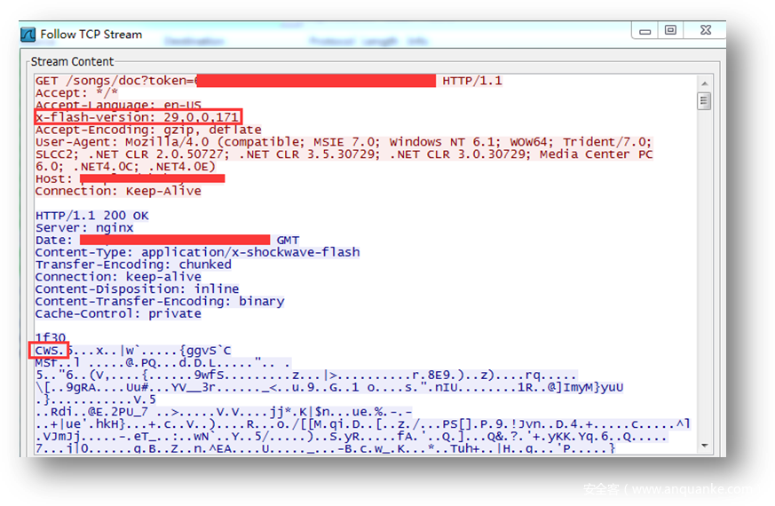 通过Flash ActiveX对象中的URL连接地址下载回来一阶段的Flash文件,该Flash文件最主要的功能是继续和远程服务器通信并下载回来使用AES加密后的第二阶段Flash文件: