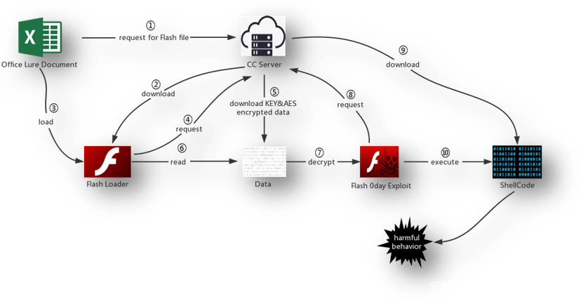 360企业安全威胁情报中心近期捕获到了一例使用Flash 0day漏洞配合微软Office文档发起的APT攻击案例,攻击使用的样本首次使用了无Flash文件内置技术(Office文档内不包含Flash实体文件)。我们在确认漏洞以后第一时间通知了厂商Adobe,成为国内第一个向厂商报告此攻击及相关漏洞的组织,Adobe在昨日发布的安全通告中致谢了360威胁情报中心。
