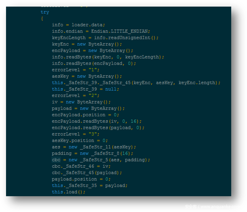 从服务器返回的数据为[KEY+AES加密数据]的形式,第一阶段的Flash文件将返回的数据解密出第二阶段的Flash文件: