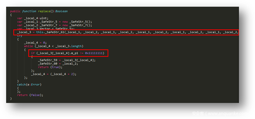 如下图所示漏洞的关键触发利用代码发生在replace函数中,漏洞触发成功后可以通过交换vector中的两个对象以转换为类型混淆来实现代码执行,函数执行前声明了两个SafeStr_5,SafeStr_7类型的对象实例,并将这两个对象实例作为参数交替传入函数SafeStr_61中,一共256个参数,SafeStr_5,SafeStr_7类型各占128个: