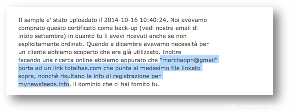 以及Hacking Team与客户的交流邮件中提到该域名和邮箱的信息: