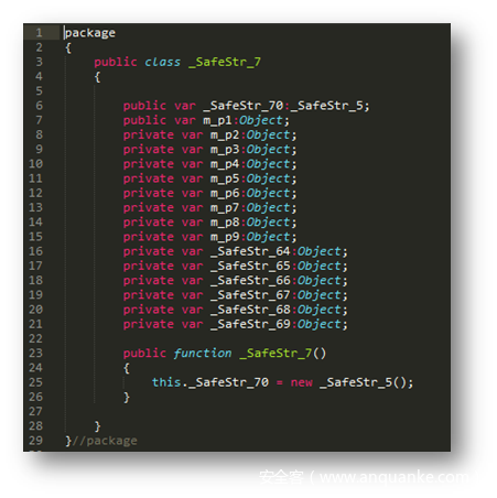 现在来看看用于触发漏洞的_SafeStr_6类实例,AS代码如下:
