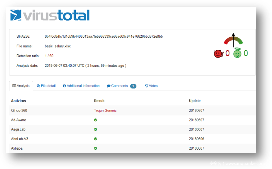 从捕获到的攻击样本语言属性、CC服务器关联信息我们推断这是一起针对卡塔尔地区的APT攻击。样本于5月31日被上传到VirusTotal以后的几天内为0恶意检出的状态,直到6月7日也只有360公司的病毒查杀引擎将其识别为恶意代码,360威胁情报中心通过细致的分析发现了其中包含的0day漏洞的利用。