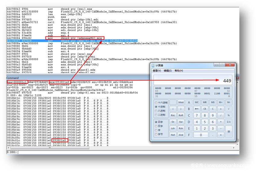 可以看到,由于Flash解析器处理对应的Try-Catch代码块时没有合理处理好异常处理代码的作用范围,解析器误认为不会有代码可以执行到Catch语句内,因此没有对Catch中代码对应的字节码进行检测,而该函数中的li8(123456)操作由于会触发异常并被Catch捕获,这样由于对Catch代码块中的代码缺乏检查,那么代码中的字节码通过setlocal,getlocal操作就可以实现对栈上数据的非法修改,最终将栈上两个对象指针的位置进行的替换,从而转化为类型混淆来实现任意代码执行!