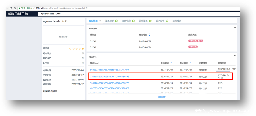 结合360威胁情报平台,该域名也关联到CVE-2015-5119的漏洞利用样本,该漏洞同样也是Hacking Team泄露事件曝光的Flash 0day漏洞!