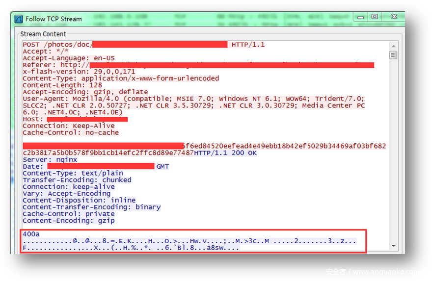 Flash 0day漏洞利用代码执行成功后再向服务器通过POST请求返回第三阶段的ShellCode并执行最后的攻击: